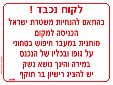 לקוח נכבד! בהתאם להנחיות משטרת ישראל הכניסה למקום מותנית במעבר חיפוש בטחוני על גופו ובכליו של הנכנס במידה והינך נושא נשק יש להציג רישיון בר תוקף