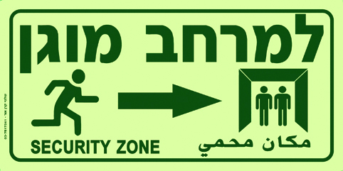 למרחב מוגן עברית/אנגלית/ערבית עם חץ ימינה