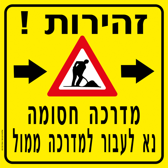 שלט זהירות מדרכה חסומה נא לעבור למדרכה ממול עם חץ ימינה