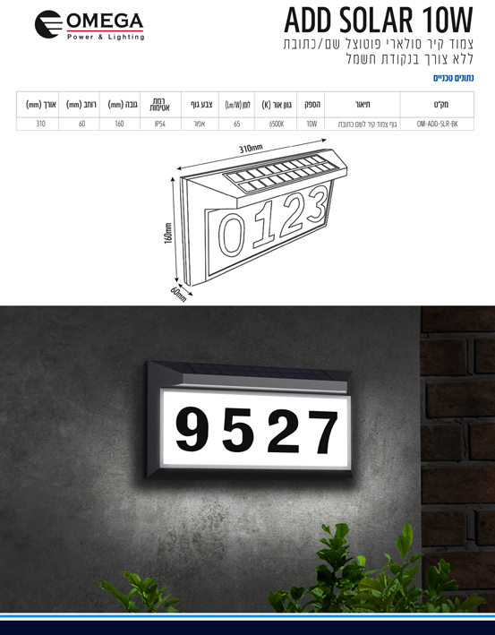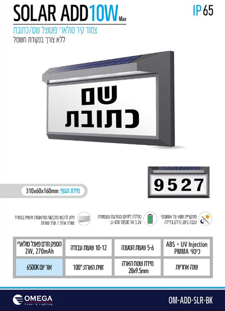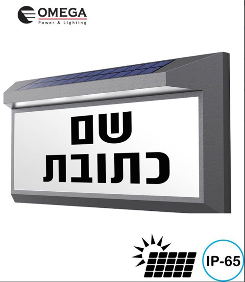 שלט סולארי מואר לכניסה לבית עם פוטוצל - כולל כיתוב - צבע שחור