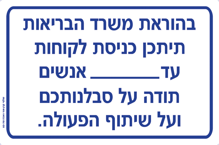 בהוראת משרד הבריאות תיתכן כניסת לקוחות עד אנשים תודה על סבלנותכם ועל שיתוף הפעולה