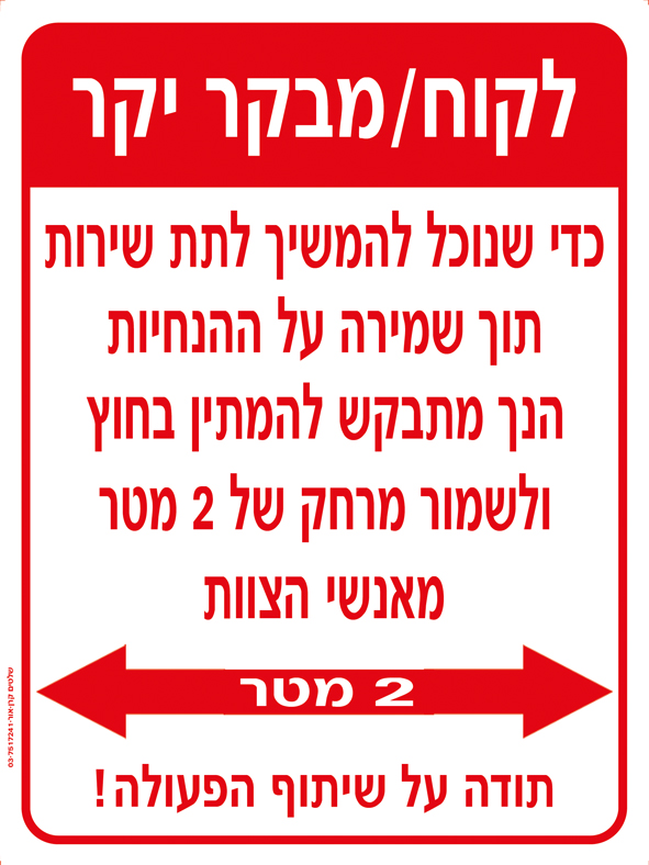 לקוח/מבקר יקר כדי שנוכל להמשיך לתת שירות תוך שמירה על ההנחיות הנך מתבקש להמתין בחוץ ולשמור מרחק של 2 מטר מאנשי הצוות