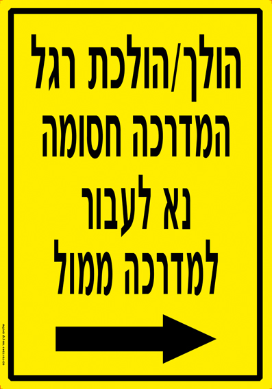 הולך/הולכת רגל המדרכה חסומה נא לעבור למדרכה ממול עם חץ ימינה
