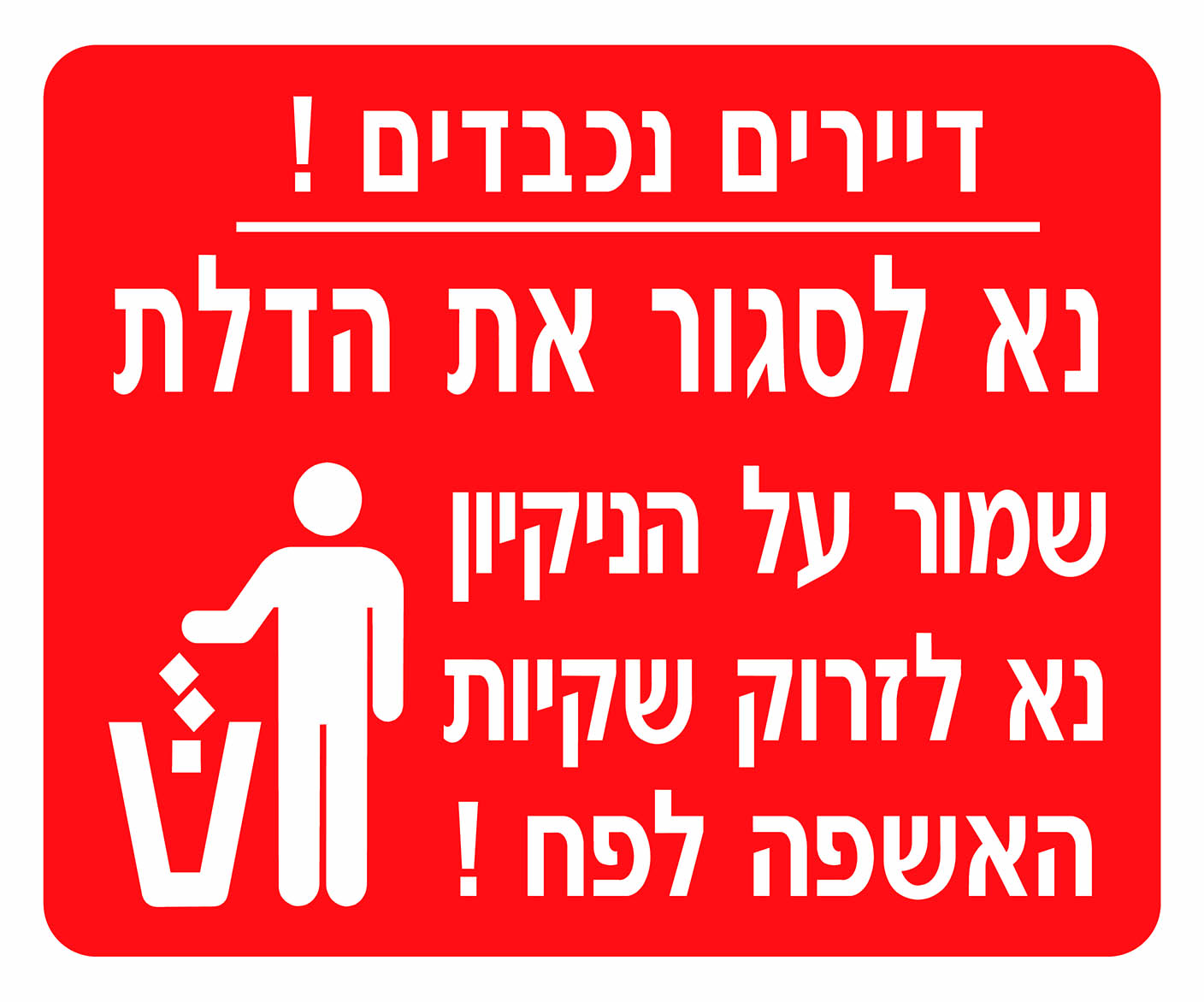 דיירים נכבדים! נא לסגור את הדלת שמור על הניקיון נא לזרוק שקיות האשפה לפח!