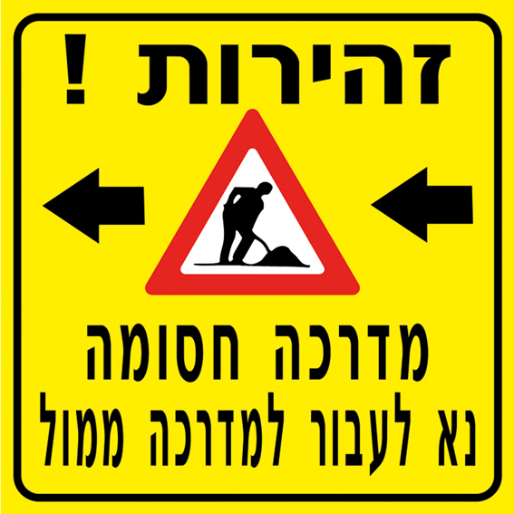 שלט זהירות מדרכה חסומה נא לעבור למדרכה ממול עם חץ שמאלה
